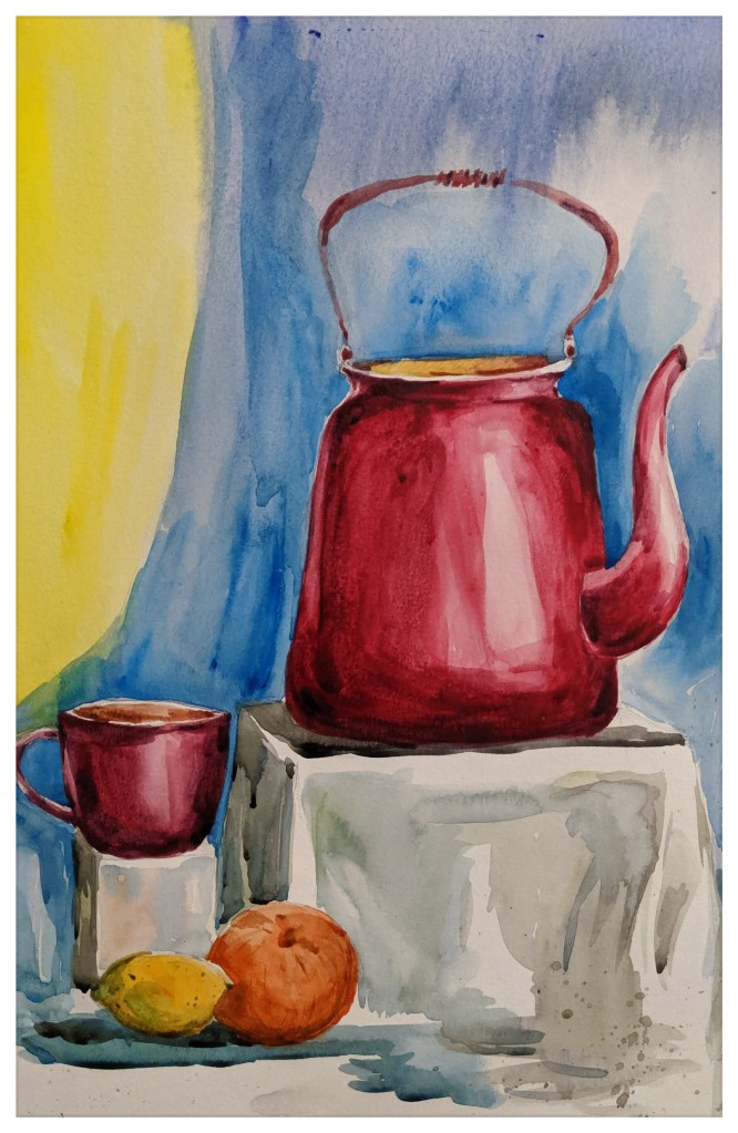 Multiple layer of color was causing serious muddying and bloating. Eventually I needed to use a coat of higher quality water color “Winsor Newton” to produce depth and dimension in the composition.